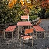 VIFAH Stainless Steel Frame Wood Composite Dining Set V1264SET1Made in the USA! The set is made from composite wood with stainless steel frame. The composite wood is manufactured from a mixture of recycled and virgin polyethylene together with new and recycled wood fiber/bamboo materials, providing the luxurious look and feel of wood, without the hassles of annual maintenance. It is also compounded with permanent UV-stabilized colors, which eliminates the need for painting, staining, waterproofing, stripping, and resurfacing. It is durable, high quality, environmentally friendly and ideal for high rainfall or high humidity locations.Key features and specification? Made in the USA!? Warranty: 1 year against manufacturing defects? Assembly: some assembly required? Item type: Patio square table? Style: Contemporary? Number of pieces in set: 1 table , 2 chairs and 2 benches? Finish: Cherry? Material: Durable composite wood top with sturdy stainless steel frame? Protective qualities: Mold, mildew, fungi, termites, rot , decay and corrosion resistance.? Table dimension: 59 L x 35 W x 29 H (inches)? Table weight: 53 lbs? Chair dimension: 19 L x 21 W x 34 H (inches)? Chair weight: 17 lbs? Bench dimension: 59 L x 19 W x 18 H (inches)? Bench weight: 34 lbs? Design features: Rectangle Table, slatted top, stainless steel frame ensures lasting use.? Sustainable claims: Renewable resource