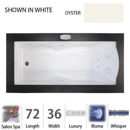 Jacuzzi FUZ7236CRL4IWY Fuzion 7236 Salon Illuma Whisper RH Oyster . Fuzion Collection:Can a Jacuzzi luxury tub double as unique home furnishings? With the Fuzion luxury bath, it certainly can. This drop-in/undermount luxury tub is unlike any other luxury tub youÂ've ever seen. Often incorporated into the worlds most classy pools, Jacuzzi s "infinity edge" overflow system allows water to spill over the edge to create the appearance of an endless body of water. Combine this state-of-the-art technology with the optional wood decking (available in a rich teak, exotic Wenge, or unfinished wood) to create an unsurpassed bathroom centerpiece. All Fuzion collection tubs also include Jacuzzi s patented twist-and-lock drain systems and an ergonomically designed pillow.Pillow Included- Ergonomically designed pillow is added for bathing comfortChrome Drain Included-No need to purchase a separate tub waste, the drain and drainage system is included with all Fuzion tubs. (Chrome finished)Infinity Edge Overflow- State-of-the-art overflow system allows water to spill over the edge into a collection chamber. This creates a unique look and feel of being in a tub much large than it isWood Deck- Optional wood surrounds are available in a rich teak, exotic Wenge, or unfinished wood. See "Accessories" to the rightMeasurements:72"L x 36"W x 24"HLuxury Salon Spa:A statement making bathroom centerpiece, Jacuzzi s line of Salon Spa s are as functional as they are beautiful. By combining the technologies of both luxury Whirlpool with luxury PureAir , Jacuzzi Salon Spa tubs give users the ability to select from over a dozen unique experiences. During each bathe, you will have your choice between Jacuzzi s legendary Whirlpool experience and the calming effervescence of PureAir . Top of the line components