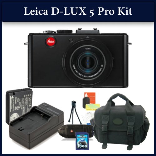 Leica D-LUX 5 Digital Camera Pro Kit Includes: Leica D-Lux 5 Digital Camera, Extended Life Battery, Rapid Travel Charger, 16GB Memory Card, Memory Card Reader, Table Top Tripod, Soft Carrying Case, LCD Screen Protectors and a Cleaning Kit